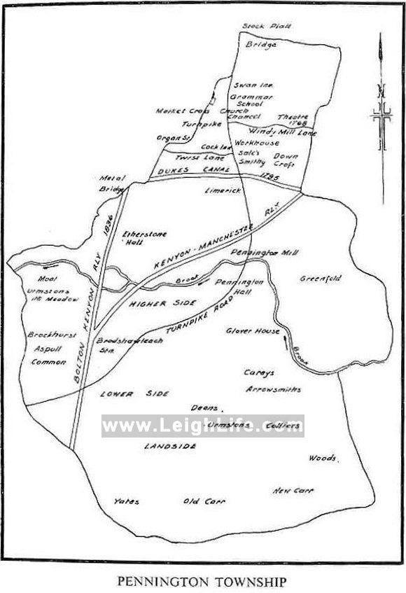 There is no village of Pennington; the whole of the township is now within the town of Leigh. It contains an area of 1,482 acres, much of which does not exceed in elevation 75 ft. above mean sea level, rising somewhat higher to the north of Pennington Brook, which traverses the township from west to east, and reaching an elevation of a little over 100 ft. on the south-west near Aspull Common. A considerable area of meadow land by the brook is liable to flood. The highroad from Leigh to Newton-in-Makerfield runs by Pennington Hall and Aspull Common. Pennington Station, formerly called Bradshaw Leach Station, on the Bolton, Leigh and Kenyon branch of the London and North-Western Railway, is near the Lowton end of the township, and on the highroad. It is the junction of the Kenyon, Leigh, and Tyldesley branch of the same railway. The duke of Bridgewater’s, now the Manchester Ship Canal Co.’s, canal traverses the township for a short distance on the south side of Leigh. The geological formation consists entirely of the pebble beds of the bunter series of the new red sandstone, with a considerable area of alluvium in the low ground by Pennington Brook. The population in 1901 numbered 9,977 persons. The Local Government Act, 1858, was adopted by the township in 1863. By the 38 and 39 Victoria, cap. ccxi, the district was merged in that of Leigh. Part of the township together with a portion of the township of Westleigh was formed in 1854 into an ecclesiastical parish. By a Local Government Order in 1894 the civil parish of Pennington was included in that of Leigh. The principal employments are those of coal-mining, cotton-spinning and weaving, and engineering. The principal landowners are Lord Lilford and Mr. C. G. Milnes-Gaskell, of Wakefield.