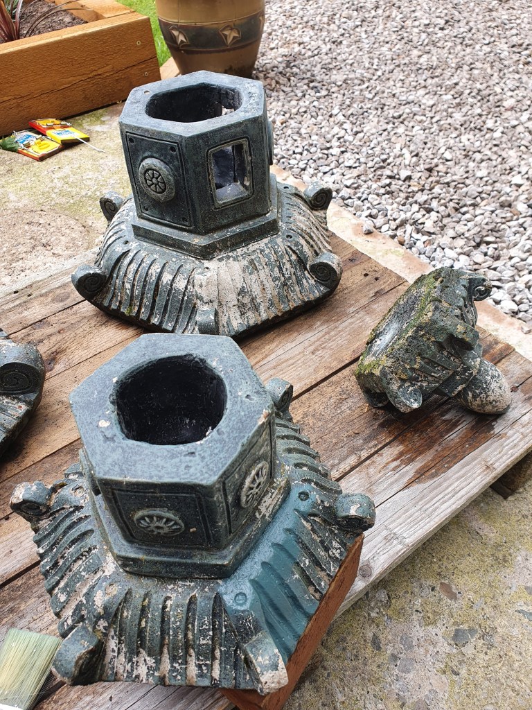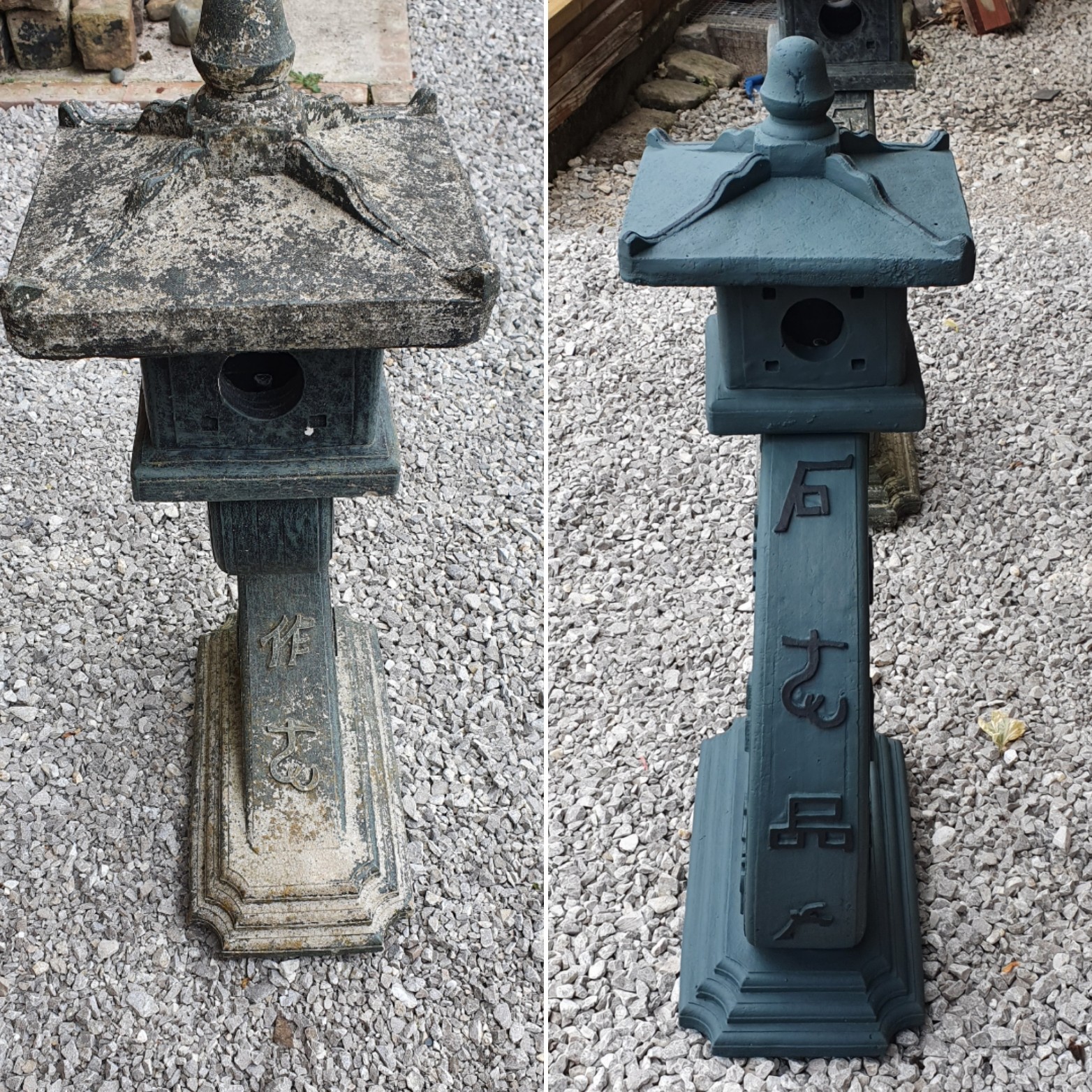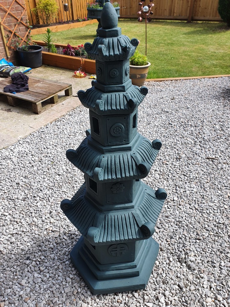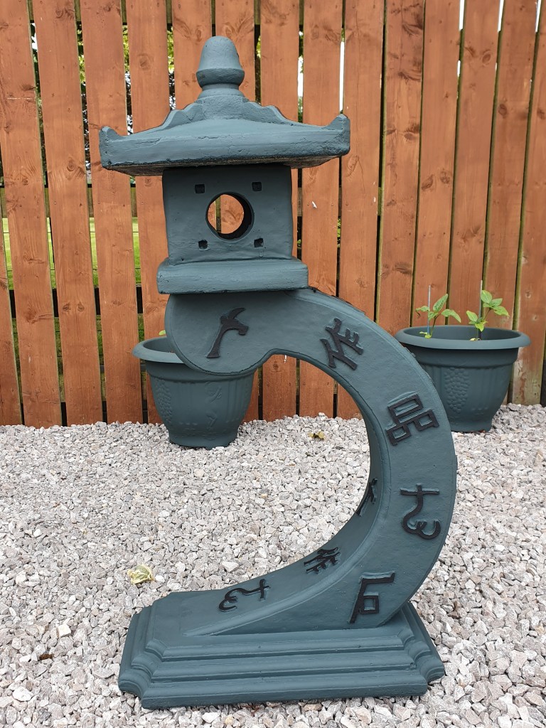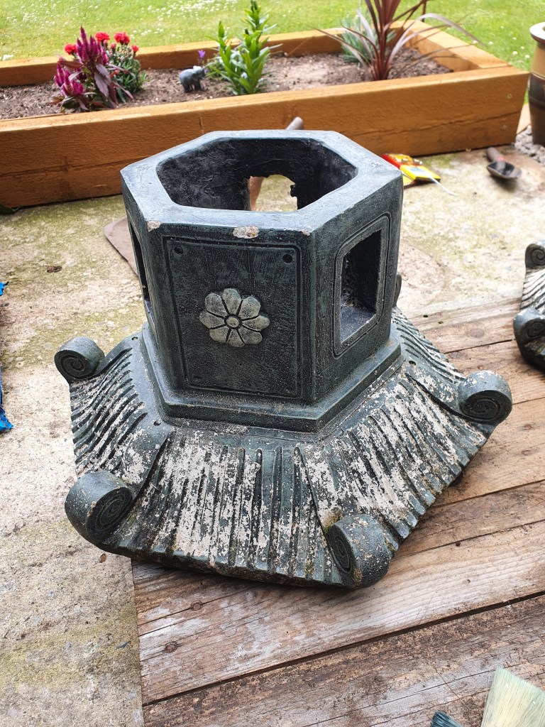 Scattered around the various corners in our cottage gardens we had various Japanese stone ornaments, extremely weathered and faded and not really in any position to of any visual benefit. So I tasked myself with scrubbing each item down, repairing where I can the items then embarking on a repaint and colouring. I started with a large Japanese fountain that was no longer functioning as a water feature, after moving this 1/4 ton piece I set about the cleaning and repair as it begins its new life as a bursting colourful flower bed, I then salvaged a large Japanese Pagoda tower again ridiculously heavy, two Japanese lanterns, two Japanese Dragons, Japanese stepping stones and lastly a Japanese bird bath (still under repair).