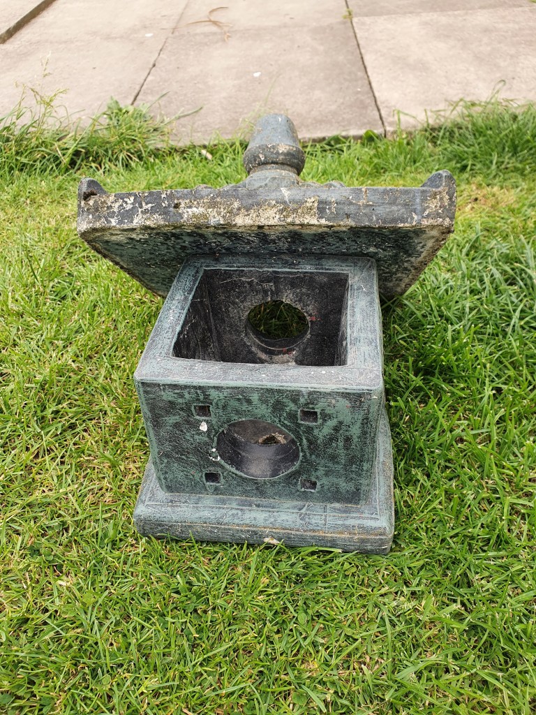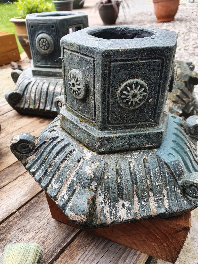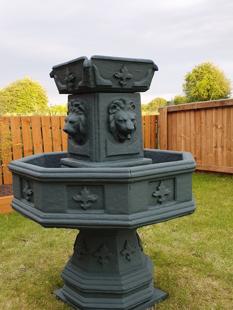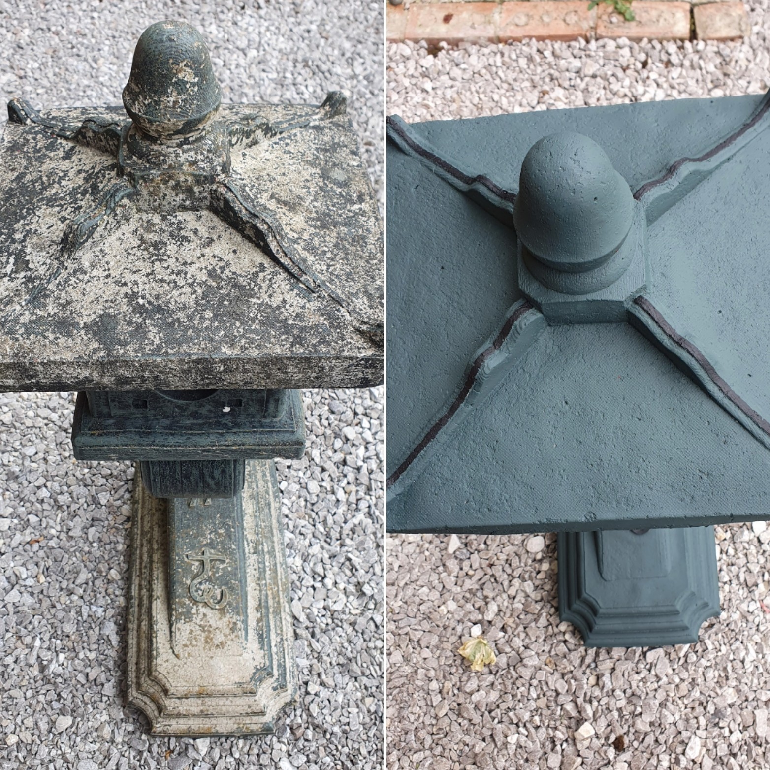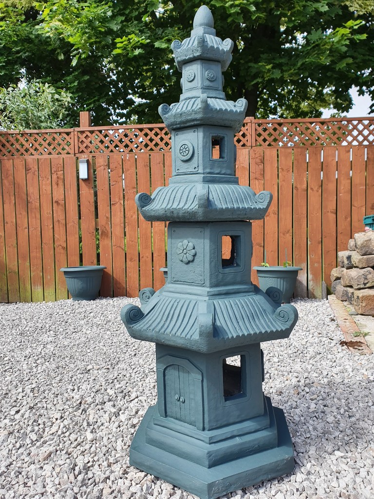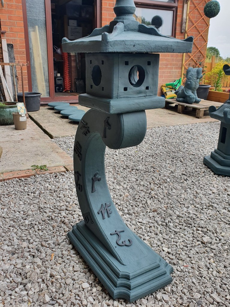Scattered around the various corners in our cottage gardens we had various Japanese stone ornaments, extremely weathered and faded and not really in any position to of any visual benefit. So I tasked myself with scrubbing each item down, repairing where I can the items then embarking on a repaint and colouring. I started with a large Japanese fountain that was no longer functioning as a water feature, after moving this 1/4 ton piece I set about the cleaning and repair as it begins its new life as a bursting colourful flower bed, I then salvaged a large Japanese Pagoda tower again ridiculously heavy, two Japanese lanterns, two Japanese Dragons, Japanese stepping stones and lastly a Japanese bird bath (still under repair).