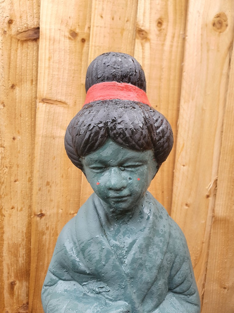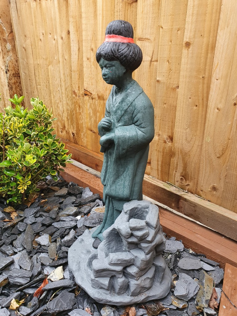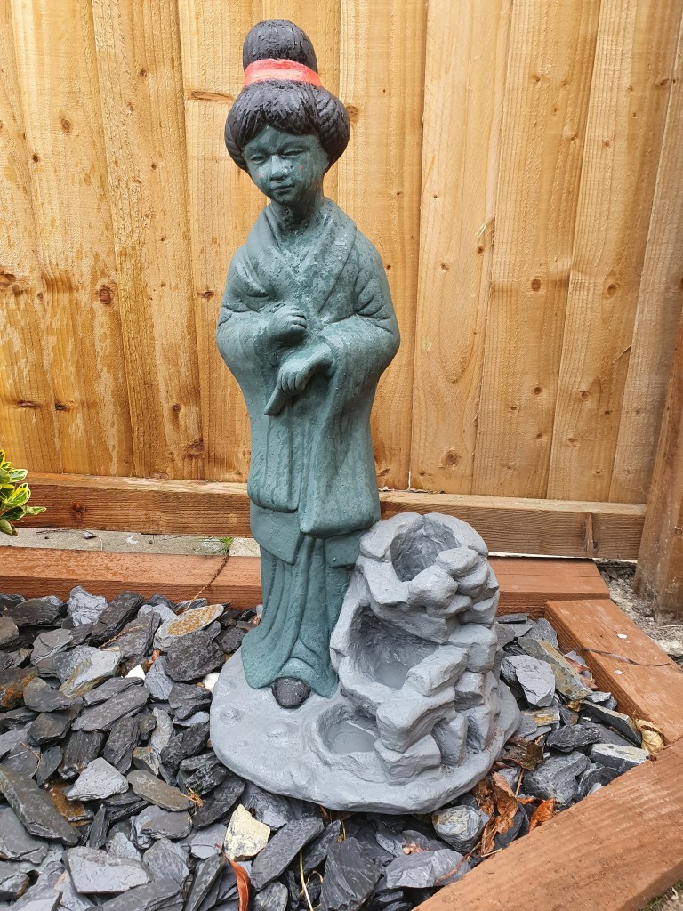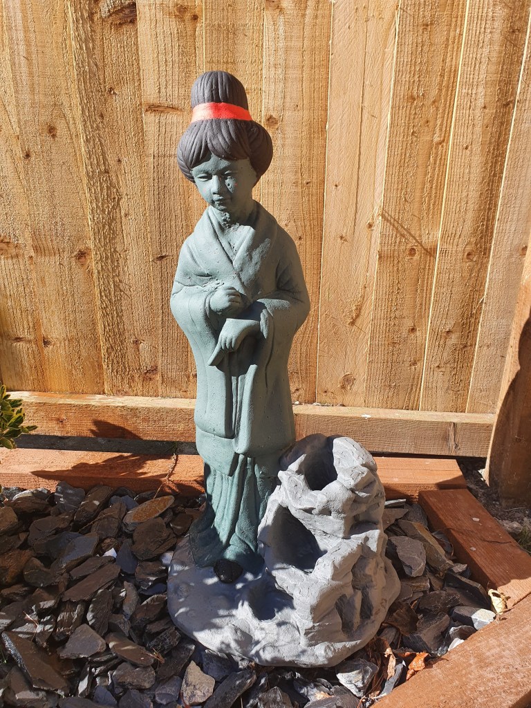 Hidden at the back of the garden under a very large conifer tree was a Japanese Geisha statue. She was originally a water feature but over time ended up hidden and covered in Wood Pigeon poop, after a substantial power washing and scrub down and some different colours added to give her an element of realism she now resides in the garden, restored once again.