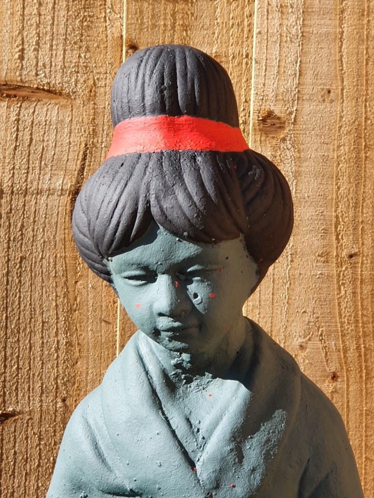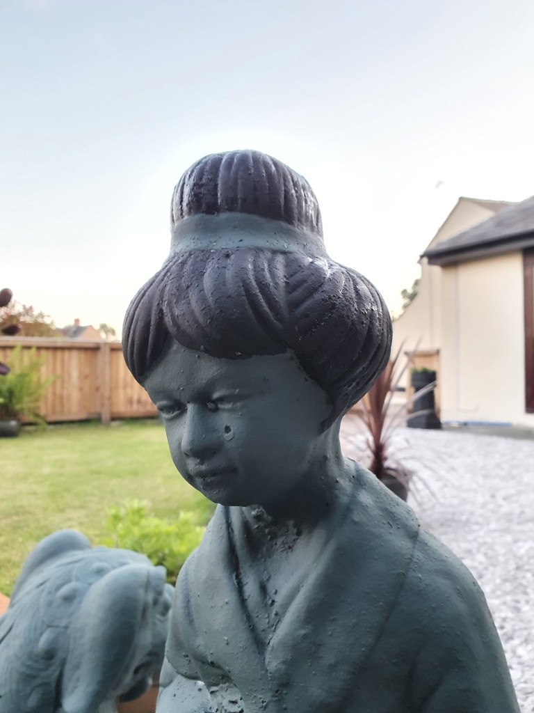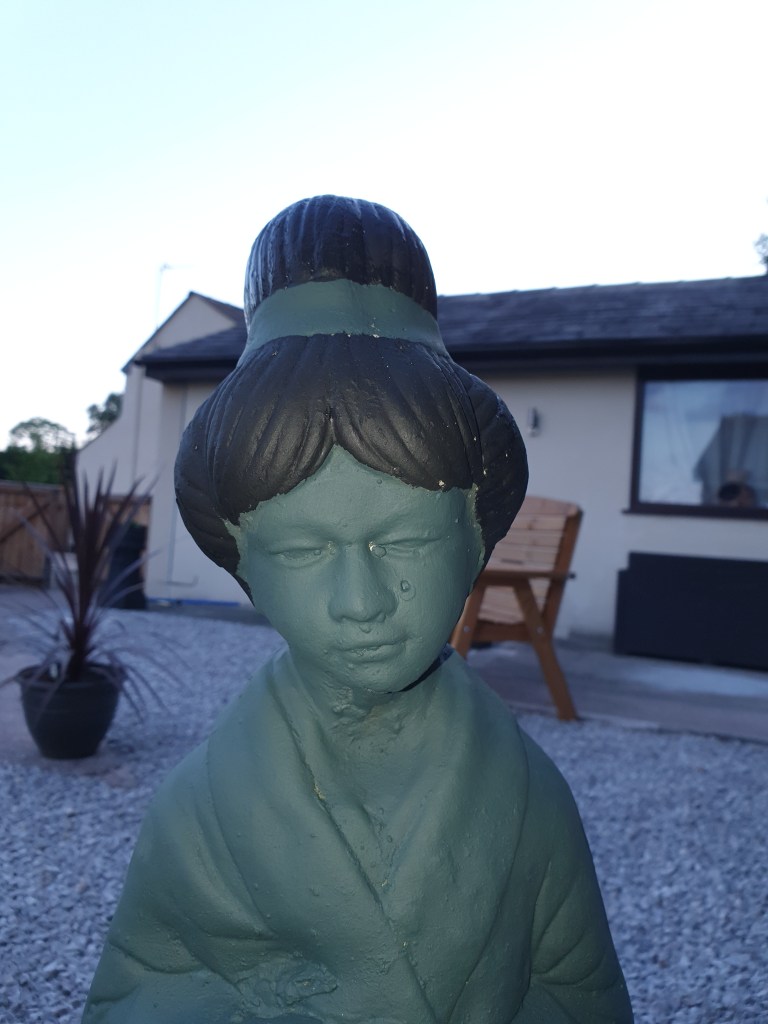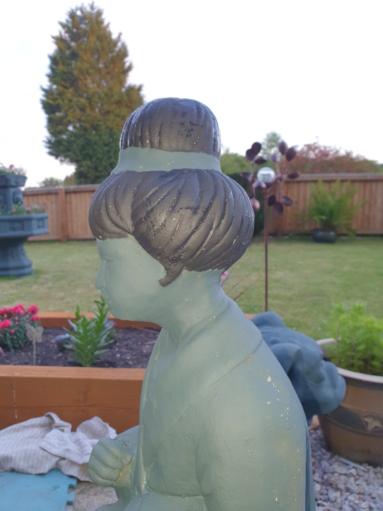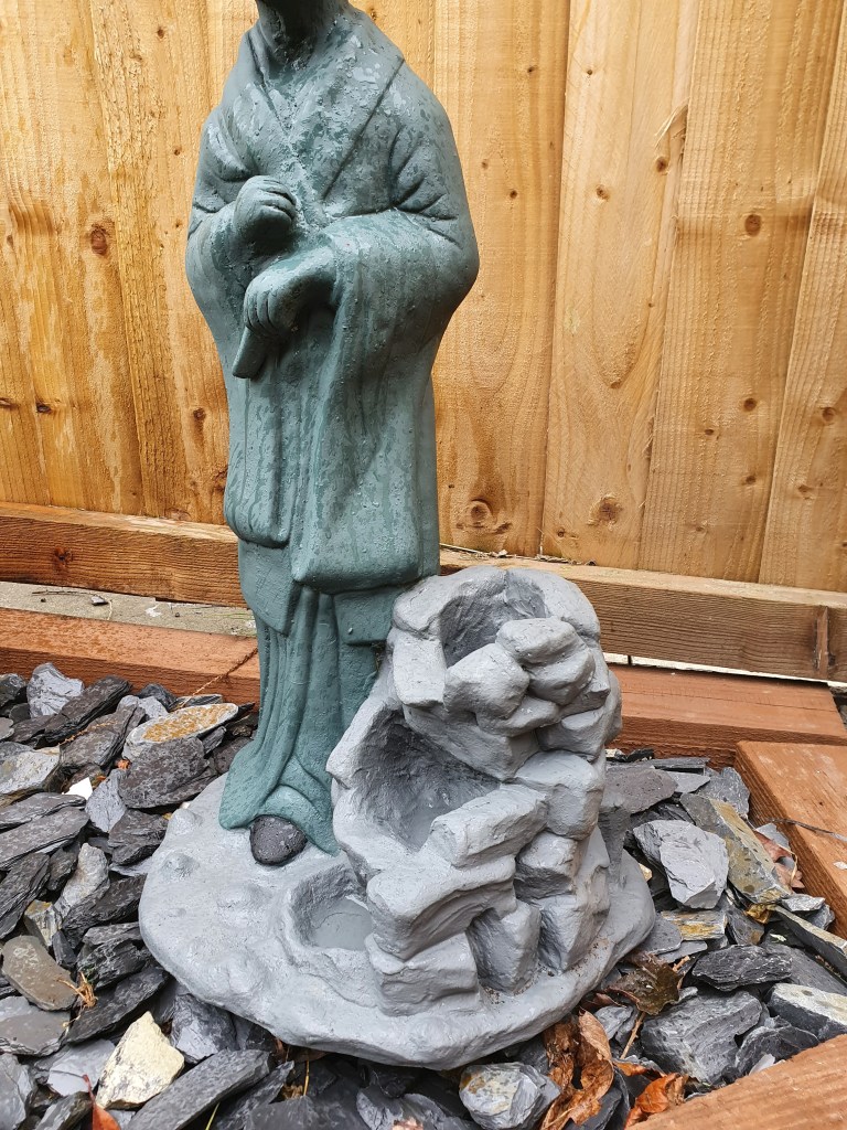 Hidden at the back of the garden under a very large conifer tree was a Japanese Geisha statue. She was originally a water feature but over time ended up hidden and covered in Wood Pigeon poop, after a substantial power washing and scrub down and some different colours added to give her an element of realism she now resides in the garden, restored once again.