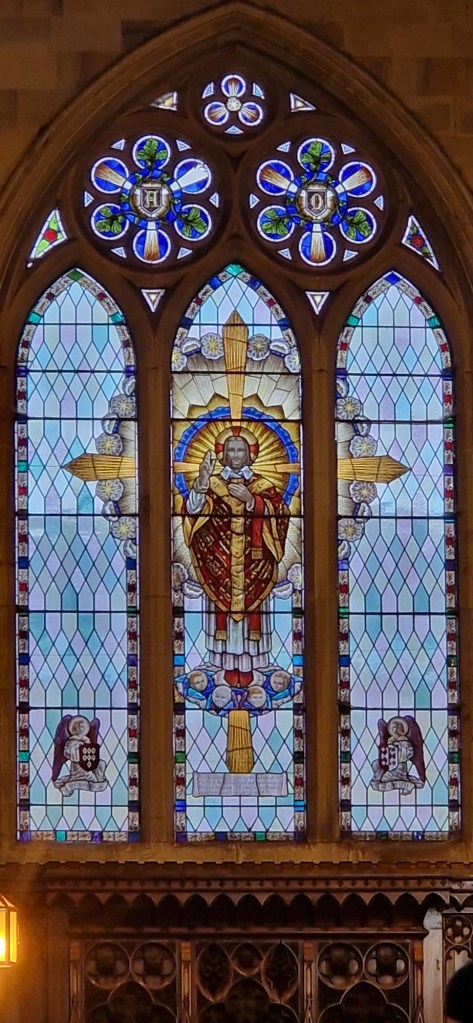 19. Here Jesus is shown as the Good Shepherd, who “lays down his life for the sheep” (John 10: 11). The words on the window are taken from the first verse of Psalm 23. “The Lord is my Shepherd, I shall not want”.