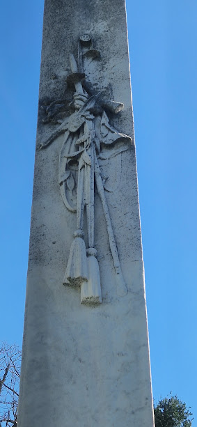 The grave itself is a tall obelisk made from white marble possibly? There is a stone in front of the obelisk that reads the following words.